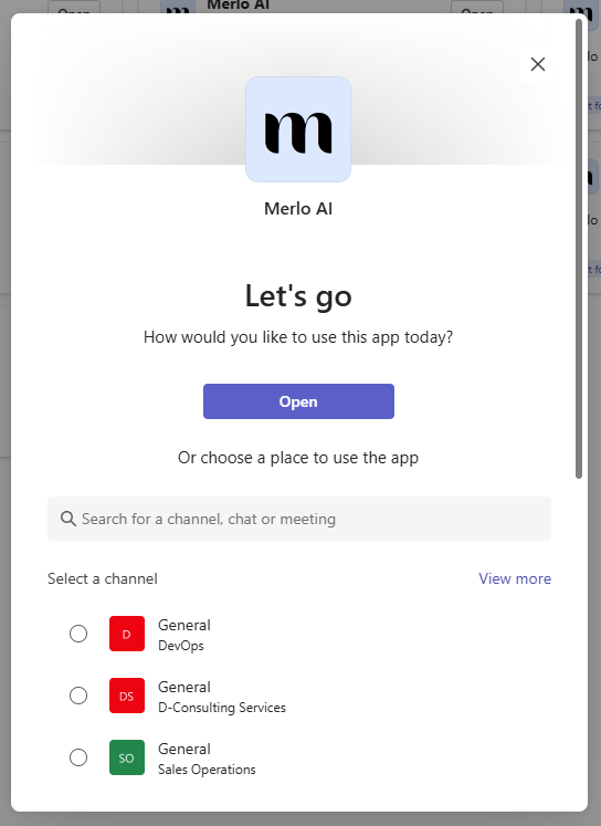 Once installed, click on the Open button and say hi in the chat window to communicate with the Merlo AI Teams agent.